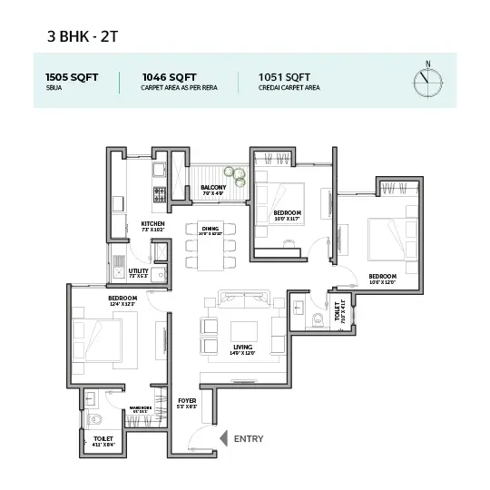 3 BHK + 2T (1505 sq.ft)